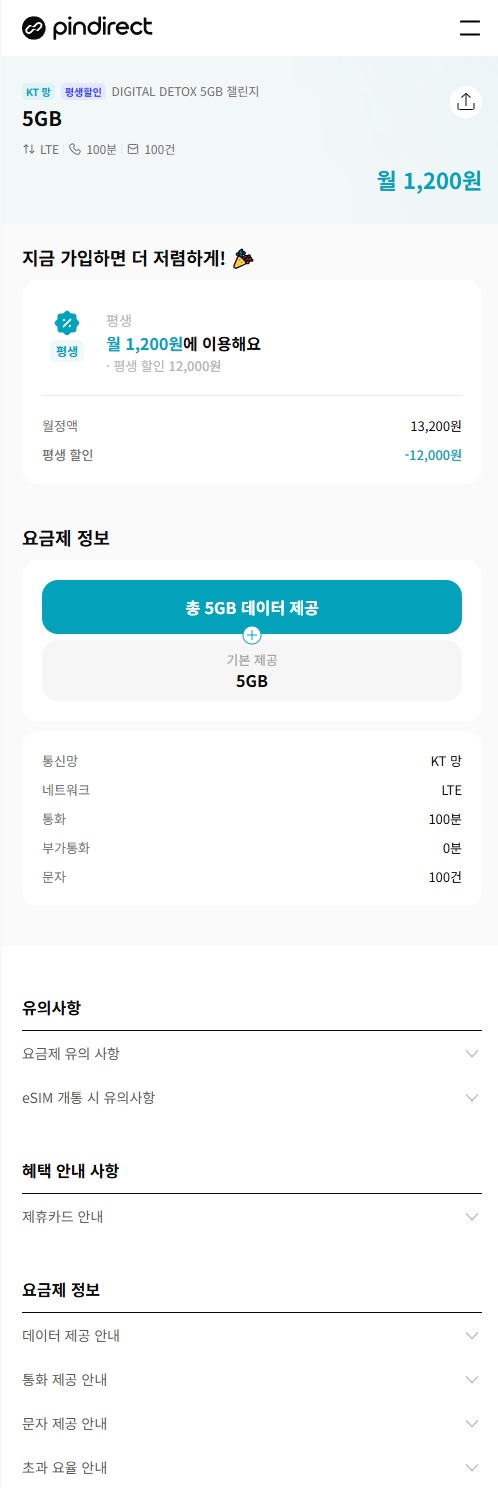 [핀다이렉트]KT 망 평생할인 DIGITAL DETOX 5GB 챌린지 5GB LTE 100분 100건 1200원(최저가갱신)(무료) 4개월 후 2만원 상품권 (선착순 500~1000명